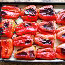 Meanwhile, cut peppers in half lengthwise. Remove seeds and white veins. Place peppers cut-side down on parchment paper. (Alternatively, rub a small amount of olive oil on the sheet tray.) Place pan in the oven for about 30 to 40 minutes, until the skin is blistery and charred. Don’t be impatient here: If the skin isn’t blistery enough, the peppers will be difficult to peel.