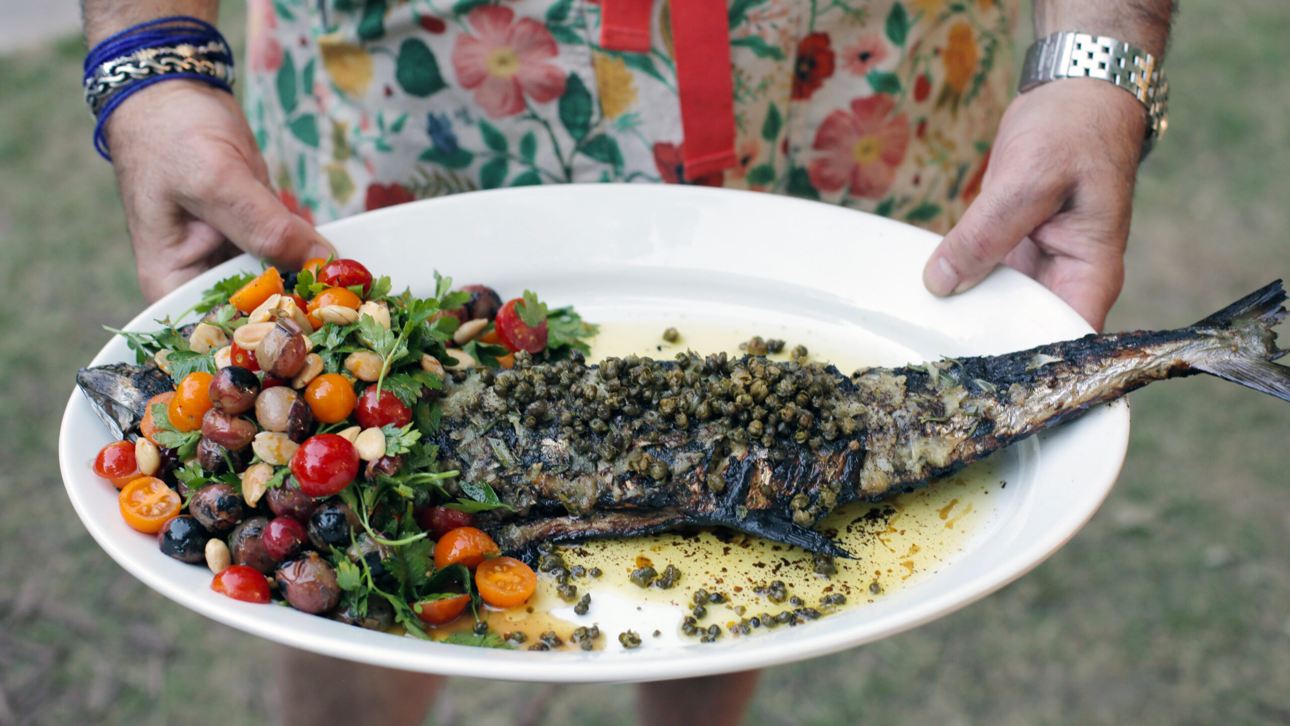 A grilled whole mackerel with caramelized onions, served with rutabaga mash and a salad of charred grapes, Marcona almonds, and fresh herbs.