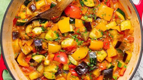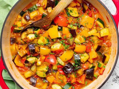 This quick and easy vegan ratatouille is a colourful, naturally gluten-free one-pot meal that's ready to eat in about 30 minutes.