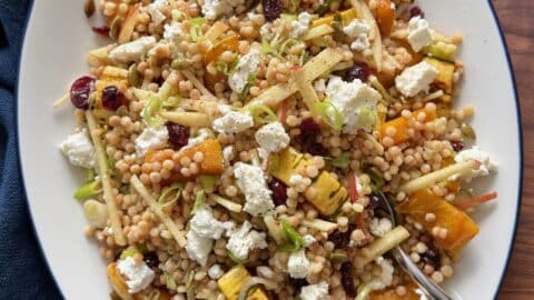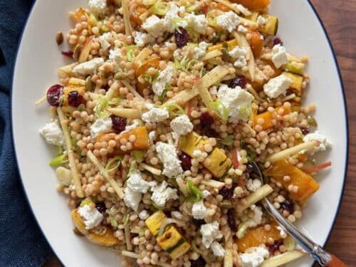 This flexible, make ahead couscous salad with delicata squash, apple, cranberries, and pepitas pairs perfectly with almost any protein.