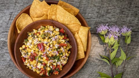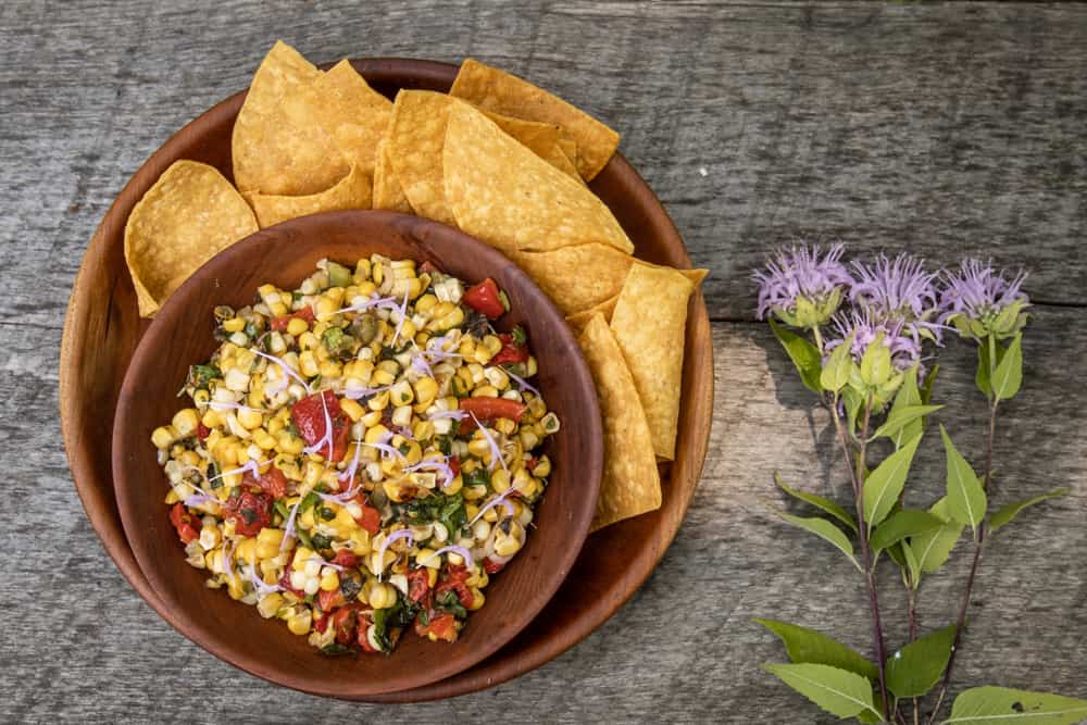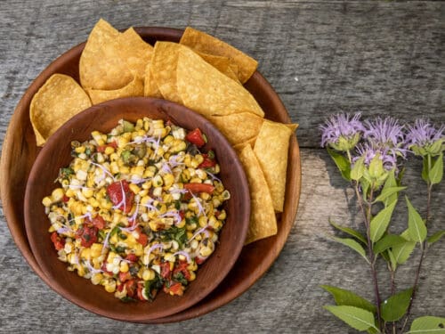Slightly spicy corn salsa made with grilled or roasted corn, fresh Monarda fistulosa leaves, and green coriander. Typically salsas don't include oil, but I like some with my corn salsas, consider that optional.