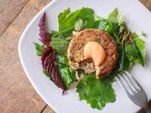 - Remove the cakes to a plate with a fresh green salad, top with a dollop of spicy mayonnaise or aioli if using, sprinkle with chives and serve with lemon wedges on the side. The cakes are also excellent served on a bun like you would a burger.