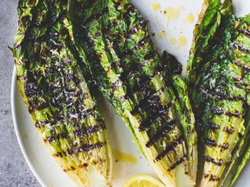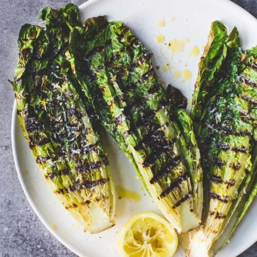 Use a grater to shave LOTS of fresh parmesan on each halve. Or, another great way to serve it is by crumbling blue cheese and bacon over the top. I also like to chop the grilled romaine heads up, then toss with cheater homemade caesar dressing and sourdough croutons or this flavorful Green Goddess Dressing! If you'd like to make it vegan, my 5-Minute Vegan Salad Dressing is so good it's drinkable, and would be an excellent way to finish the grilled lettuce.