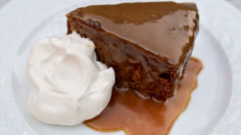 - Turn the cake out onto a platter with the bottom side facing up, and poke this side liberally with a toothpick or skewer, again out to the edges and into the center. Repeat with spreading the caramel over the cake a few tablespoons at a time to allow it to absorb. Let the cake rest for 15 minutes or up to several hours, uncovered, before serving.