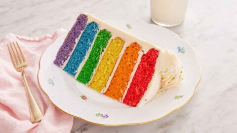 This Rainbow Cake recipe is moist, tender, and beyond stunning with its six different colored cake layers! The brightly colored cake will be the star of the show!