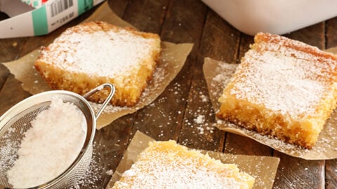Bake for about 40 minutes or until the edges are brown but the center is still jiggly. Allow to cool completely before slicing into squares. Sprinkle with additional powdered sugar, if desired.