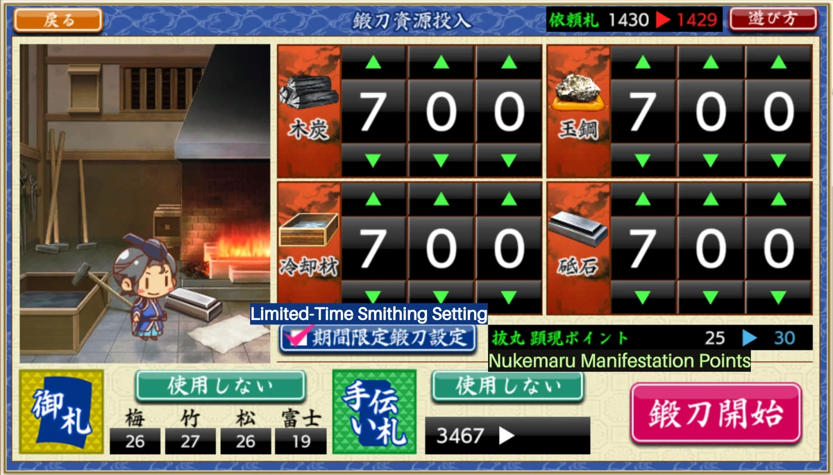 Smithing allows players to create new swords. Creating a sword consumes resources, consisting of charcoal (木炭) , steel (玉鋼) , coolant (冷却材) , and whetstone (砥石) . Each smithing also requires a Request Token (依頼札). A Help Token (手伝い札) can be used to skip the wait time for the smithing. All of...