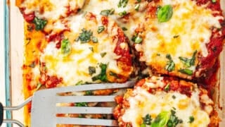 This baked Eggplant Parmesan recipe (aka eggplant parmigiana) is classic Italian comfort food at its finest, with crispy eggplant rounds, savory marinara, and gooey cheese. We've tested our recipe over and over to make it easier than most homemade versions, and it's a total crowd pleaser!