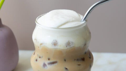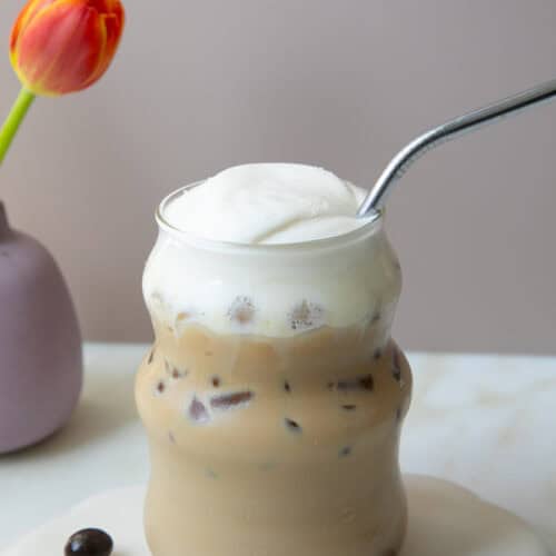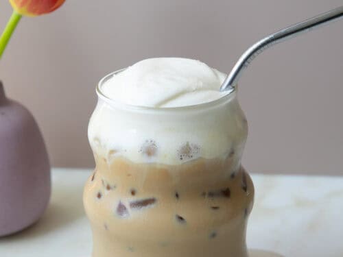 - Pour the espresso over the ice. Pour in your milk of choice. I like to leave about 2 inches of room so there's space for the cream top. Mix it up.