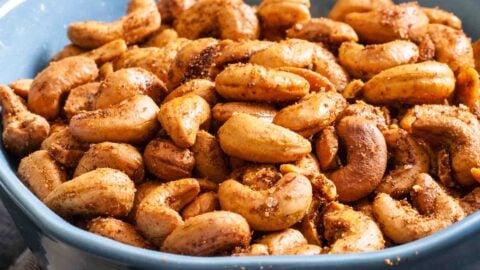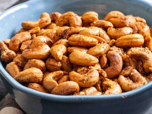 I love these roasted cashews for an easy party snack. They’re coated in garlic, herbs, spices, and sugar that take them to the next level. Better than store-bought any day!