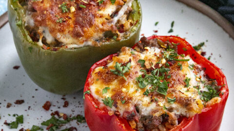 This is the quintessential stuffed bell peppers recipe I grew up on, with bell peppers stuffed with seasoned ground beef, rice, and melty cheese, always a hit! They bring back so many memories.
