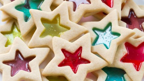 Stained Glass Cookies are sure to impress people of all ages! These crisp buttery cookies are cut into festive shapes and filled with hard candies, then they're baked and the candy melts into an even layer for a beautiful stained glass effect. A delicious cookie to add to the cookie tray this year!
