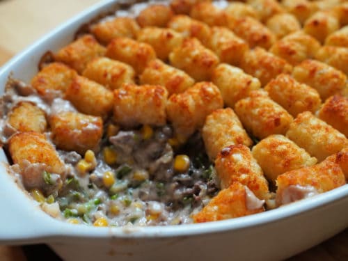Echo Rivera on 2022-02-02 (5 stars): This is my family recipe as well. I make this for my family and they love it. I do bake my tater tots in the oven first then I top the casserole after it's been cooked. That way all the tater tots are completely crispy all the way around. Thank you for sharing your recipe.