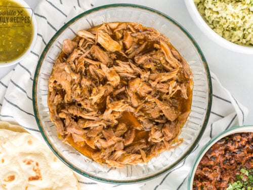 Remove pork from the slow cooker and discard any liquid left in the pot. Shred pork.