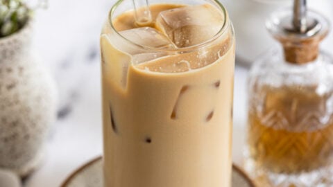 Latte: Brew espresso or strong coffee as needed (or use cold brew concentrate) and add it to a drinking glass. Stir in the vanilla syrup and fill the glass with ice. Top with milk and stir to combine as needed.