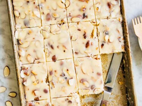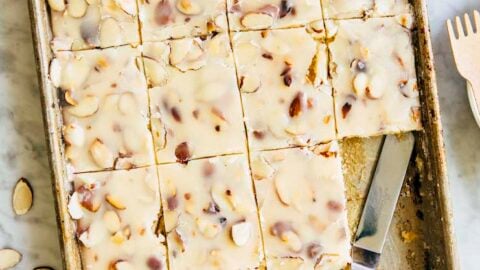 This white Texas sheet cake recipe is made with a sour cream almond cake base, topped with almond butter frosting and sliced almonds! The recipe is a small batch version of traditional Texas sheet cake and made in a 9 x 13 inch pan.