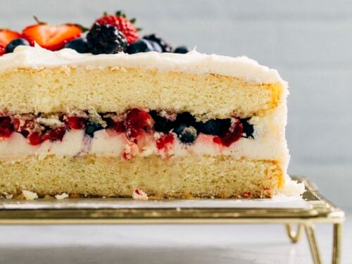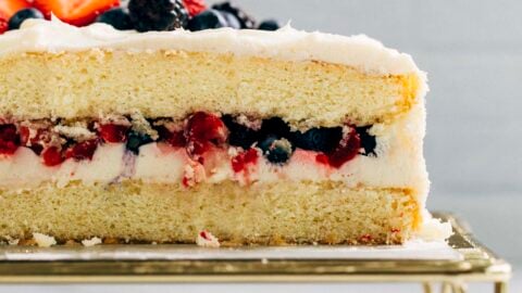 Make your own berry chantilly cake at home with this 8-inch sheet cake recipe! This small batch copycat of the viral Whole Foods cake features almond white cake, chantilly mascarpone frosting, and fresh berries.