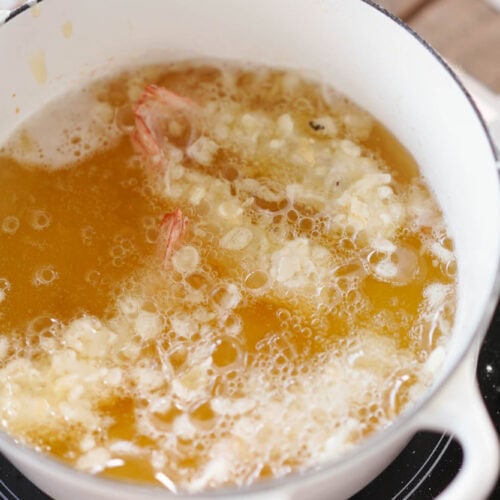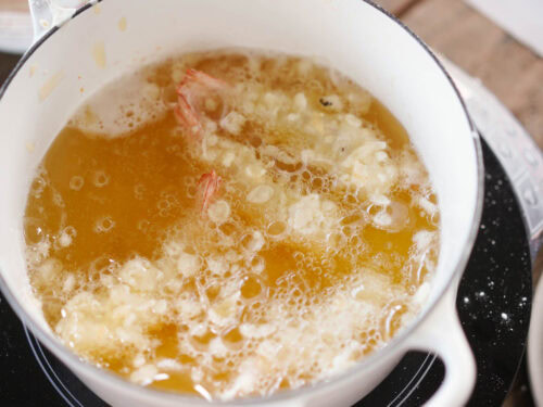 - Shrimp: Clean the ½ lb shrimp under running water and remove the heads. Devein the shrimp. To straighten your shrimp, score very shallow (⅛ inch) cuts on the belly of the shrimp. (You can also use skewers to straighten the shrimp if you don’t want to score them). Straighten the shrimp on a plate over paper towels to dry the shrimp off.