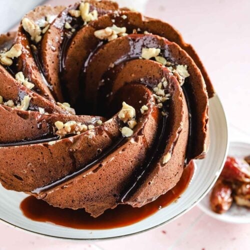 This date cake recipe is moist, simple to make, and delicious. Topped with abutter glaze, it’s spiced with cardamom, cinnamon, ginger and clove, and packed full of dates. Date cakes are popular in Iraq (where I’m from), so I’ve had my fair! This cake uses mashed Medjool dates and chopped walnuts.