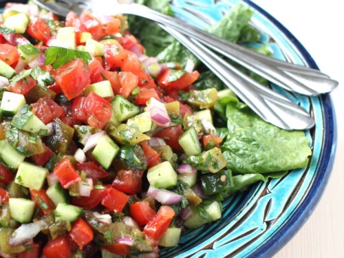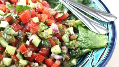 Fresh Moroccan Salad is bright and flavorful. Tomatoes, cucumbers, onions, and roasted peppers in a fresh lemon and cumin dressing brightens any meal. Serve as a first course or side dish.