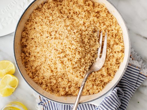 This easy lemon couscous recipe is one of our favorite side dishes. I toss the light and fluffy pasta with olive oil, garlic, fresh herbs, pine nuts, and lemon juice. It's so simple and delicious!