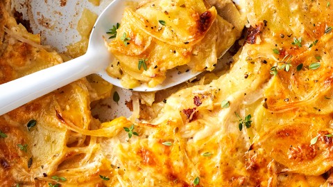 Cover and bake for 30 minutes, then uncover and bake for 35 to 40 minutes, or until the potatoes are tender and the cheese on top is browned. Let stand at room temperature for 20 minutes before serving.
