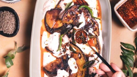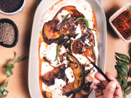 Sliced eggplant pan fried in very little oil and then layered with spiced yogurt followed by a drizzle of tempered hot oil! Doi Begun is a popular Bengali eggplant curry, except I make it little untraditional way. Typically yogurt will be cooked along with the spices and eggplant. This recipe doesn't call for that which makes it a very quick meal. It's light on the tummy and great on warm days too.