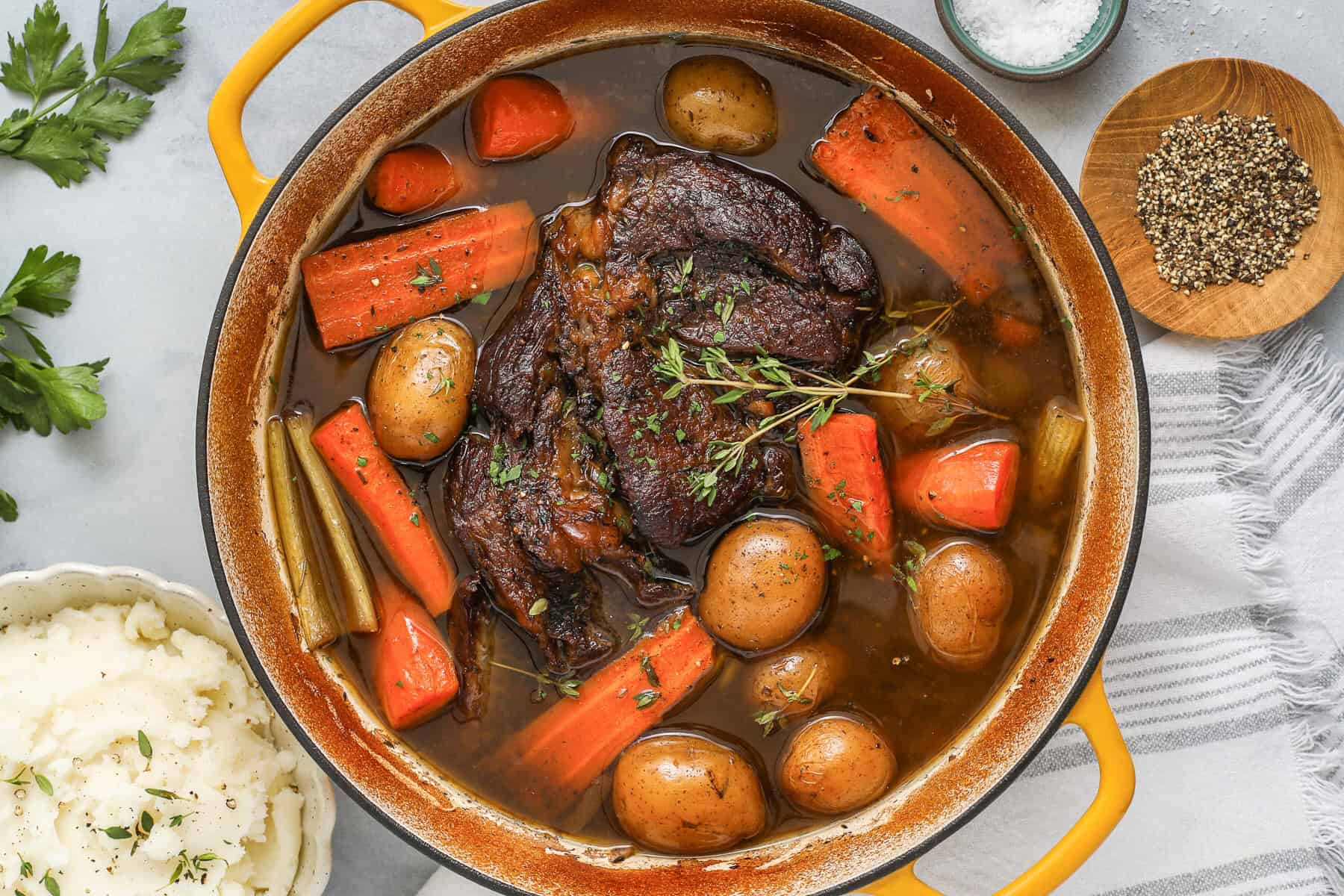 I love to use two separate pots and split the recipe in two, which leaves more room for more vegetables! This way I can get greedy with the potatoes >:) This strategy occasionally requires more broth to help cook the vegetables, so I make sure to separate, reduce and skim the broth after its done before incorporating it into the meal so the ratios aren't off. I make it earlier in the day, fix up the broth and then let the roast soak it in through the afternoon so it is rich and delicious by dinnertime! Thanks for this recipe, it's a great base to adjust to however we're feeling!!