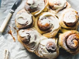 - Make-Ahead Option (Freeze): Place the cut & shaped cinnamon rolls into a parchment lined 9-inch springform pan. Cover with two layers of plastic wrap. Freeze until ready to use. The night before baking, remove the old plastic wrap and replace with fresh wrap (this prevents any condensation from dripping onto the rolls). Defrost overnight, about 10-12 hrs. at room temperature, approximately 67 F. Bake the following morning as directed.