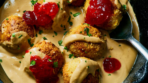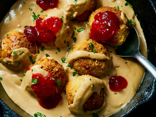- Serve over mashed potatoes or buttered noodles, smothered in sauce, sprinkled with parsley and with dollops of lingonberry jam or cranberry sauce.