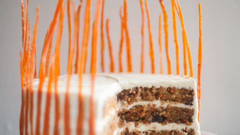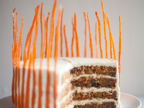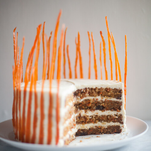 This carrot cake is perfectly spiced, moist and unbelievably good! Using candied carrot peels as decoration (optional), cream cheese frosting and sweetened shredded coconut, this cake is simply the best — I make it all the time! A half batch can be made in three 6-inch round cake pans and it only needs to bake 20-25 mins.