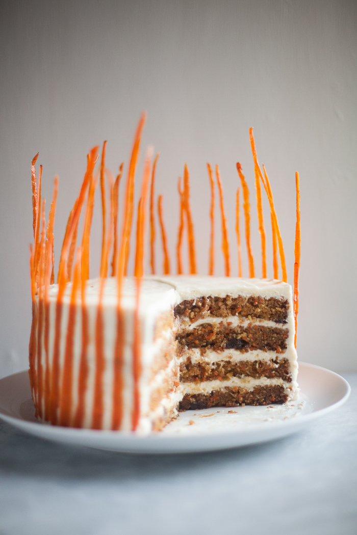 candied carrot peels, carrot cake, carrot cake with cream cheese frosting